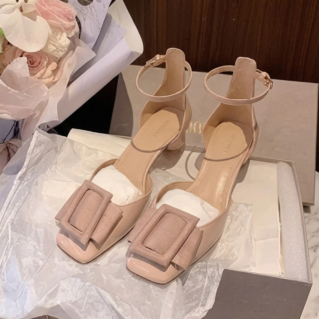 Crafted with a smooth patent finish, these heels feature a structured square toe and a bold buckle detail that adds a refined, feminine statement. The delicate ankle strap ensures a secure fit, while the low block heel provides stability and all-day comfort.